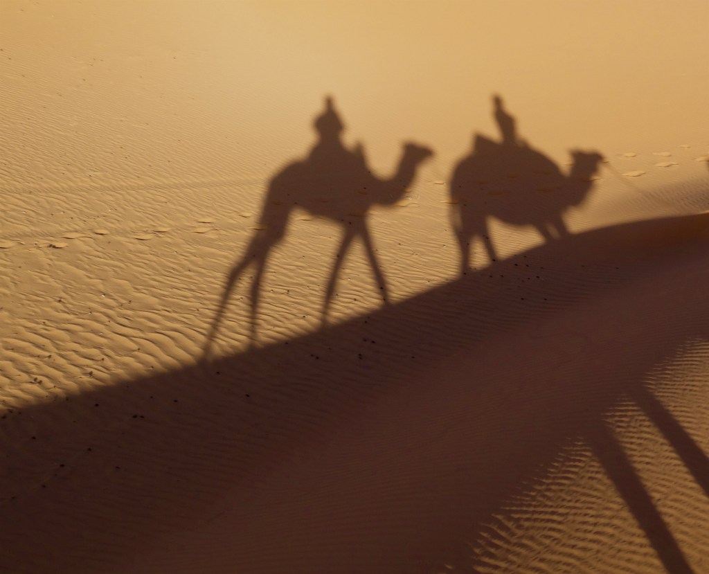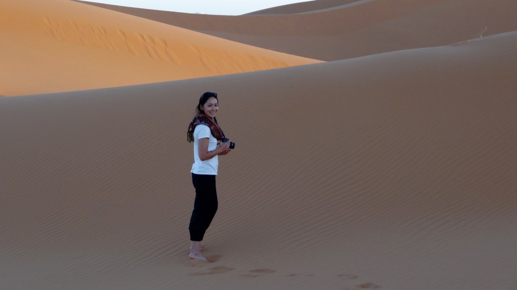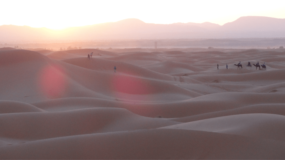 The sun painted the golden sand in beautiful shades of bright orange and gentle pink. My scarf protected my head, shielding it from the intensity of the midday sun. We traveled through the Erg Chebbi dunes at a leisurely pace. My legs dangled on each side of his rib cage, six feet above the yellow sea of sand. He wasn’t the most comfortable ride, but I couldn’t complain—I was the one sitting on his back. His hooves softly brushed the sun-scorched sand. His lashes were long and thick. Sometimes he would turn towards me, requesting a scratch on his long woolen neck. His name was Africa, an athletic and elegant 21-year-old dromedary, a worker of the desert.