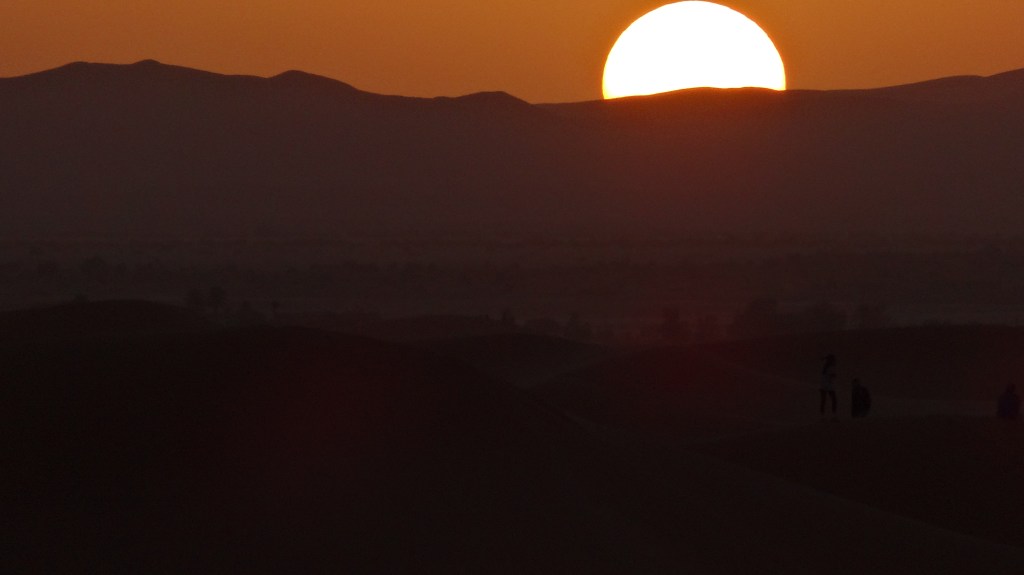There, perched atop the sandy mound, were fellow early risers. Wrapped in blankets, their cameras mounted on tripods, they eagerly awaited the unfolding scene. I gazed toward the horizon, where the vast expanse of sand met the distant mountains. And then, between two jagged peaks, I saw it: the first rays of the sun, piercing through the serene blue morning light.