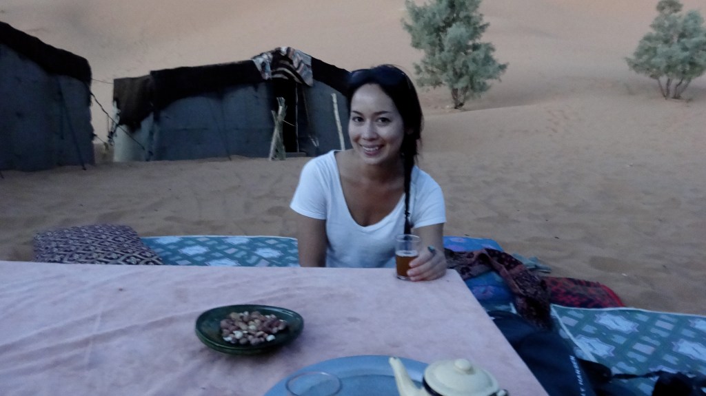 Exquisitely crafted Imazighen carpets adorned the sandy floor in front of each tent, adding a touch of beauty and cultural richness to the desert camp. A low table, covered with handmade blankets, was carefully arranged, surrounded by soft cushions for added comfort. The chameliers took charge of preparing and serving a delectable dinner, treating us to a mouthwatering traditional couscous accompanied by the authentic flavors of Moroccan mint tea. As the evening unfolded, the camp was illuminated by the gentle flicker of candlelight, creating an intimate ambiance in the heart of the desert. With the soft sand beneath us and the African sky sparkling above, we enjoyed a truly memorable dining experience amidst the serene beauty of the desert.