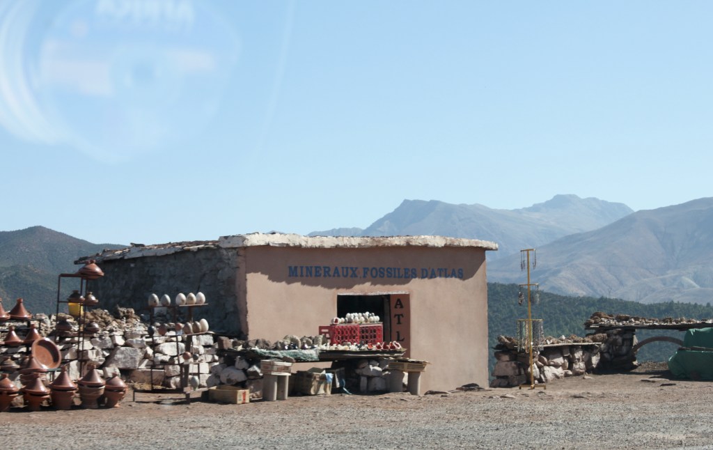 We set off from Marrakech early in the morning, heading south towards Zagora. The two Kasbahs we visited along the way were just as impressive as the drive itself. The winding road through the Atlas Mountains was breathtaking, with its earthly peaks and vast dunes forming a stunning backdrop. The lunar landscape was adorned with a variety of fruit trees, such as olives, oranges, lemons, dates, and figs, adding vibrant colors to the scenery. We even spotted Berbers and their goats climbing the mountains, searching for a meal and occasionally causing rocks to tumble onto the paved road. As we traveled, I caught glimpses of men riding donkeys for long distances, artists showcasing their handmade pottery and crafts, and vendors selling fascinating fossils and mineral rocks from the Atlas region.