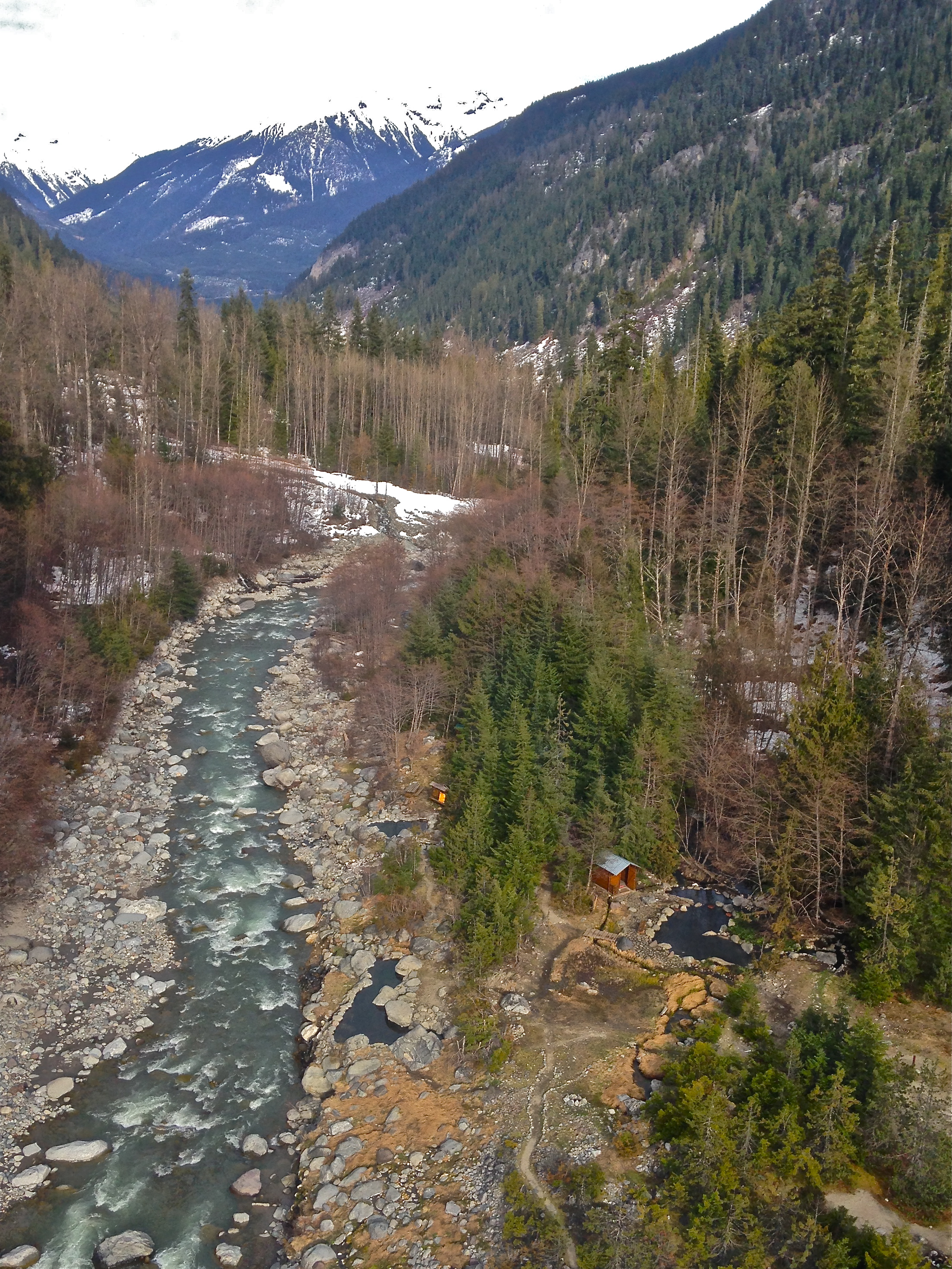 OH MY! I’ve been in a couple heli rides before. One in Cayman Islands when I lived there, as part of advertising, and one above the Garibaldi Range to pick up my boyfriend that built a hiking trail there at the time. However, I’ve never flown over my town, and especially not to the hot springs. Last time I went to Meager Creek Hot Springs, it was by snowmobile, before the bridge wiped out in 2009 due to a destructive mudslide, the second largest landslide in Canadian history. The idea to fly above my home mountain range and access secluded hot natural pools exceeded my expectations of this Sunday adventure. It is a privilege to have friends with good connections.