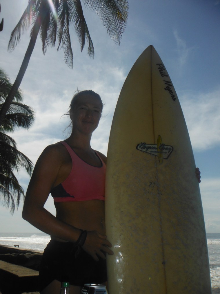 Julie about to conquer the raging waves of El Zonte during our trip to El Salvador.