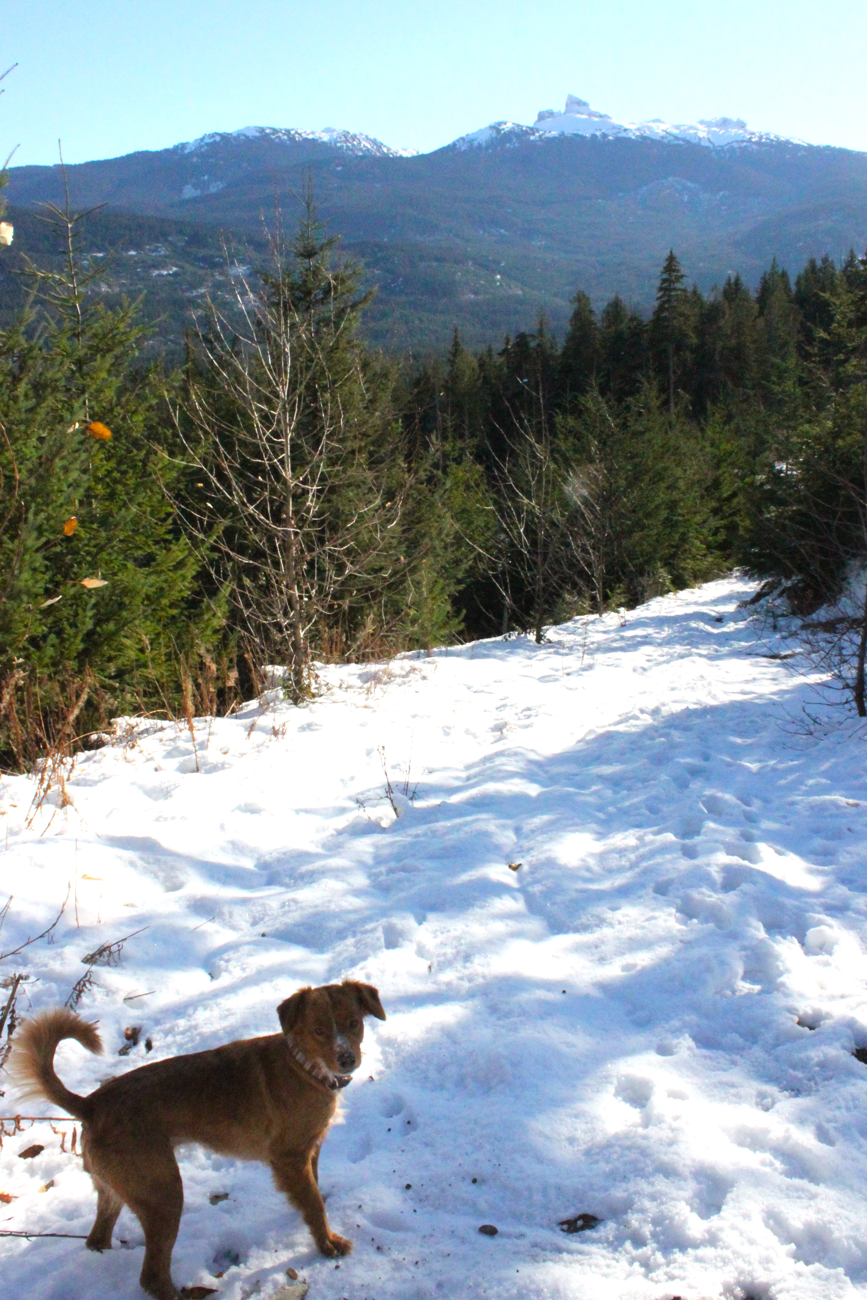 Winter solstice is still a couple of weeks away, but the days are already colder and snow covers the grounds here in the mountains of Whistler. It was such a nice day today, and such an enjoyable morning walk with the pups. I love how I can just open the door of my trailer and walk the trails through the forest. And the views are simply stunning.